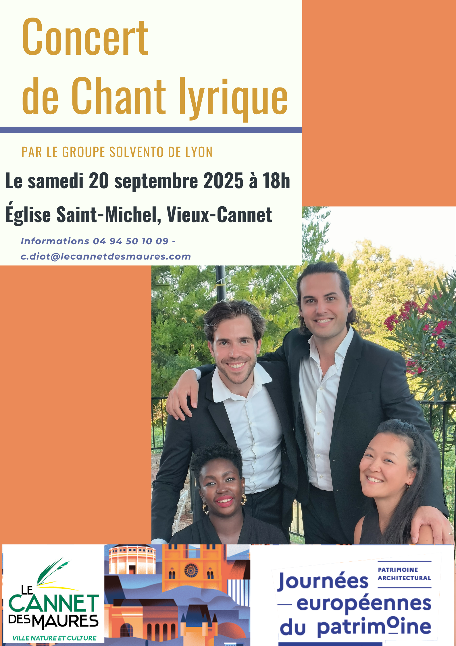 Le samedi 20 septembre 2025 à 18h à l’Église Saint-Michel du Vieux-Cannet, concert de chant lyrique par le groupe SOLVENTO de Lyon.