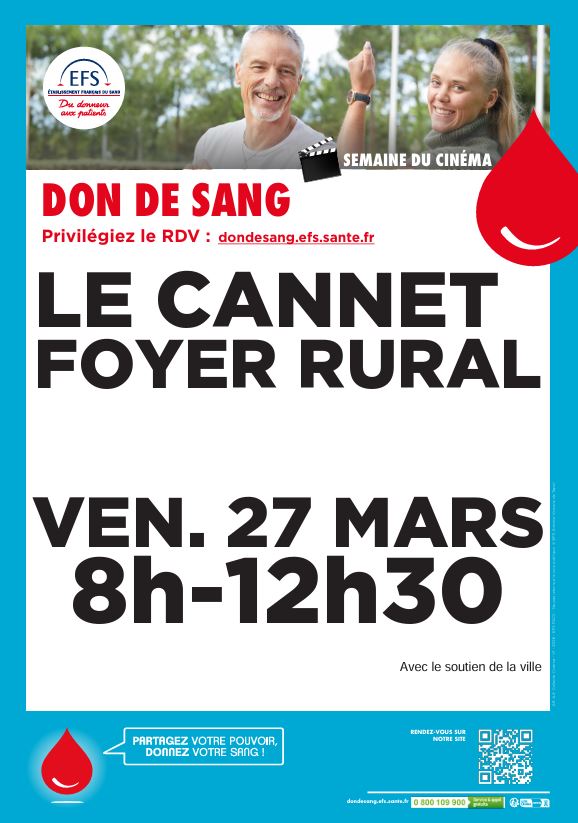 Vendredi 27 mars 2026 de 8h à 12h, collecte de sang par l’association des donneurs de sang aux grand et petit foyers.
